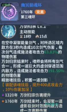 幽冥狼魂环:在凝聚能量剑气之后,可以给区域中的所有敌人全部都造成伤害。最吸引人的是在万剑归宗结束之后就可以达到间隙合一的作用,而且还可以给敌方群体全部都会造成物理性伤害,所造成的伤害是非常可怕的。