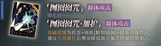 普通攻击“囫囵囵咒”为基础群攻技能,命中时造成术法伤害,同时消耗“默契同调”状态并提升自身攻击力。当处于大招“唱予无忧之诗”的持续期间,该技能将升阶为“囫囵囵咒加护”,额外附加降低敌方暴击防御的效果。这一机制显著提升了全队暴击输出效率,属于典型的团队增益型辅助设计。