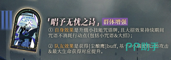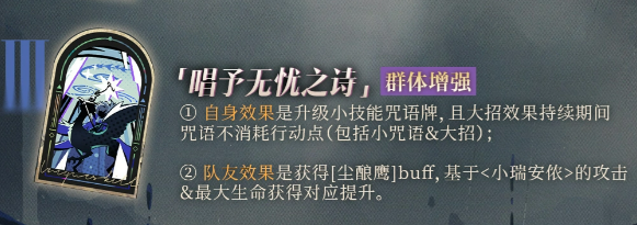 终极技能“唱予无忧之诗”为范围强化技。施放后,小瑞安侬所有已习得的咒语牌(含一、二技能及大招自身)均获得等级提升;更重要的是,在技能持续期间,所有咒语释放不再消耗行动点。与此同时,全体友方单位将获得“尘酿鹰”增益状态,其数值依据小瑞安侬当前攻击力与最大生命值按比例动态提升对应属性,实现真正意义上的双维驱动型辅助。