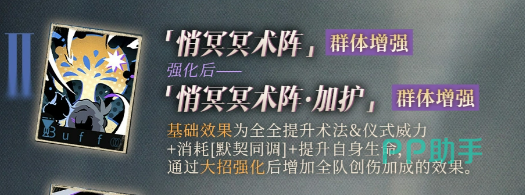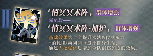 二技能“悄冥冥术阵”为全队增益类技能,基础形态可提升全体术法威力与仪式威力,并消耗“默契同调”状态,同时提升小瑞安侬自身最大生命值。强化后升级为“悄冥冥术阵加护”,额外赋予全队创伤加成。该属性对需长期压制或应对高韧性Boss的战斗场景具有显著战略价值。