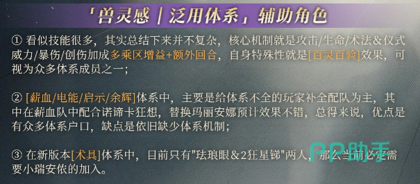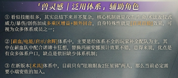 在薪血、电能、启示与余辉四大主流体系中,小瑞安侬主要承担阵容补强职能,尤其适合尚未集齐完整核心角色的玩家。例如在薪血队中,她可作为诺谛卡狂想的稳定搭档,替代玛丽安娜出场,在实战中展现出相近甚至更优的协同表现。尽管她暂未绑定某一体系专属机制,但正因这种高度泛用的设计逻辑,使其在当前术具体系中具备不可替代性——目前该体系仅有珐琅眼与两位狂星锑可用,小瑞安侬的加入实质上填补了关键功能性空缺。
