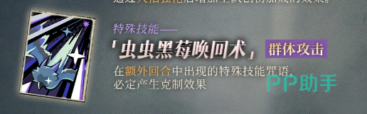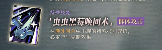 特殊机制“虫虫黑莓唤回术”仅在额外回合中触发,为群体术法攻击,且必定触发克制效果。该设定确保其在非主控轮次中仍保有稳定控场与破防能力,增强战术容错率与节奏掌控力。