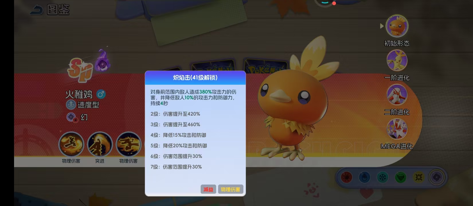 【炽焰击】于41级开放,标志着火稚鸡从单点突破转向战场调控。该技能对前方范围敌人造成380%攻击力伤害,并附加10%攻击力与防御力降低效果;技能升级后,减益幅度最高可达20%,影响范围同步扩大30%。在团战密集区域释放,既能削弱敌方前排坦度,亦可显著提升我方全体输出转化率,是改变战局走向的核心功能技。