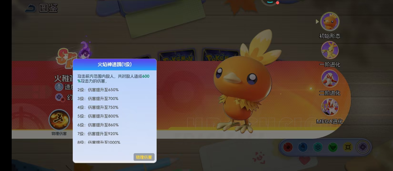 【火焰神速踢】作为火稚鸡的初始主动技,作用于正前方扇形区域,造成物理伤害。基础倍率随技能等级线性提升:1级时为600%攻击力,升至8级后达1000%。该技能兼具清场效率与战术延展性——前期可快速压低敌方整体血量,中后期在多目标环境中配合控场队友,能稳定触发连段输出,是衔接战斗节奏的关键前置技能。