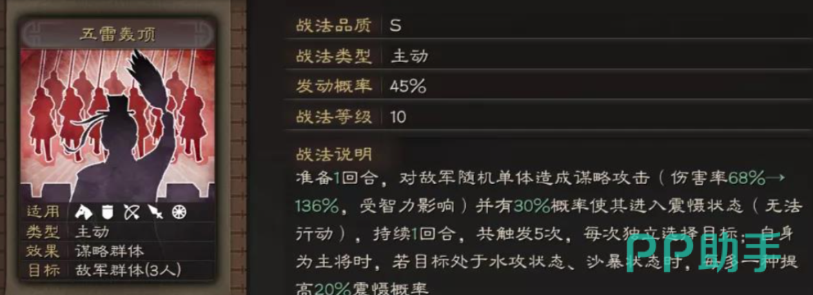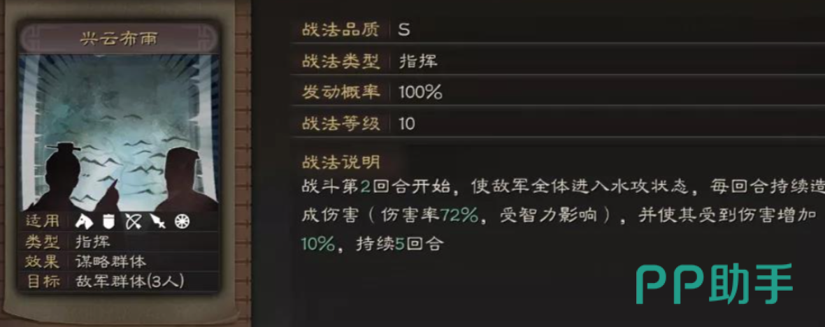 于吉的核心技能“兴云布雨”是他立足群雄阵容的关键所在。该战法能对敌方全体施加“水攻”状态,并附加一定量的法术伤害。除了稳定的群体伤害外,该技能更重要的作用在于其附带的控制效果,可有效打乱敌方节奏,为己方输出创造有利条件。当于吉与张角共同出战时,二者形成极强的协同效应:张角利用雷系技能打出连锁爆发,而于吉则通过水攻状态提升敌人陷入震慑的概率,实现控场与高伤的完美衔接。