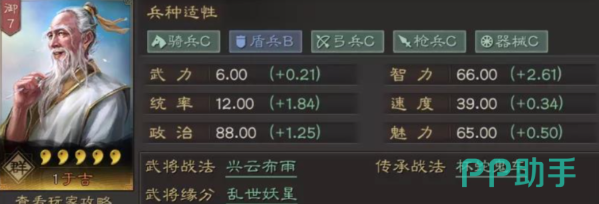 从基础数据来看,于吉的武力值偏低,难以承担主力输出职责;智力水平尚可,但在面对顶级谋略型对手时仍显不足。真正让他具备竞争力的是高达1.84的统率成长值,这一数值保障了他在战场上的生存能力和持续作战稳定性。此外,他拥有30%的“仙人”特性,这项特质使他不受兵种类型的限制,能够灵活搭配骑兵、步兵或弓兵等多种单位,极大提升了阵容构筑的自由度。