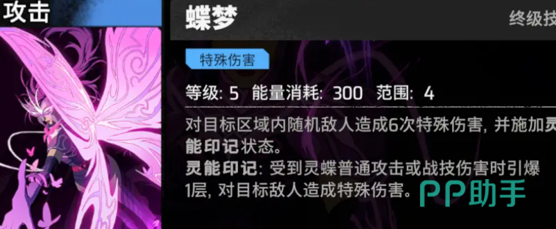 在技能体系方面,灵蝶的一技能“理智1”可强化追击伤害,配合被动实现连续压制。而她的终极技能则具备极强的范围打击能力——释放后将进入指定区域,对随机敌人发动六次独立的精神打击,并叠加灵能印记状态。当目标受到普攻或技能命中时,会引爆一层印记,造成额外特殊伤害。值得注意的是,在施放战斗技能过程中,每造成一次单体伤害即可积累追击资源,但位移类技能无法自定义落点位置。