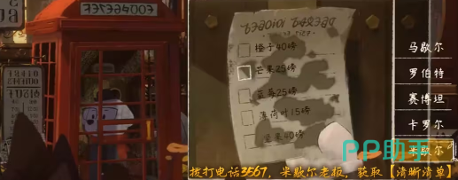 后续继续根据系统的指引来到水果店老板的店门前和老板npc进行对话之后,能够获取到一个订货清单。之后玩家要来到电话亭里打电话,在打电话的同时询问清单的时候,这里要注意要选择米歇尔老板。之后再把获取的清单交给米歇尔老板,做上车后这一章节就快结束了。