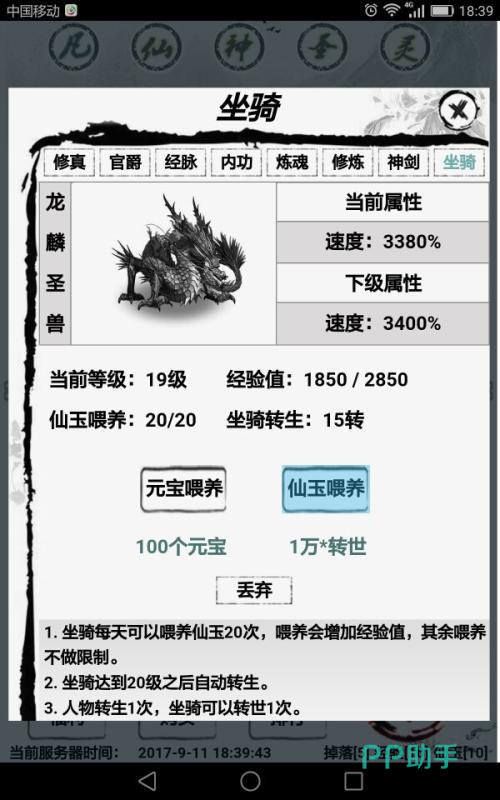 玩家从凡人起步,历经淬体、筑基、结丹等境界,体验一步步攀登仙道的成长过程。文字驱动的叙事方式让修炼过程更加沉浸,每一次闭关、突破、斗法都牵动着命运的走向。游戏内的经脉系统赋予角色更深层次的成长路线,选择不同心法将决定未来战斗风格。坐骑培养不仅提升移动能力,还能通过转生获得额外属性,使修行之路更加多变。