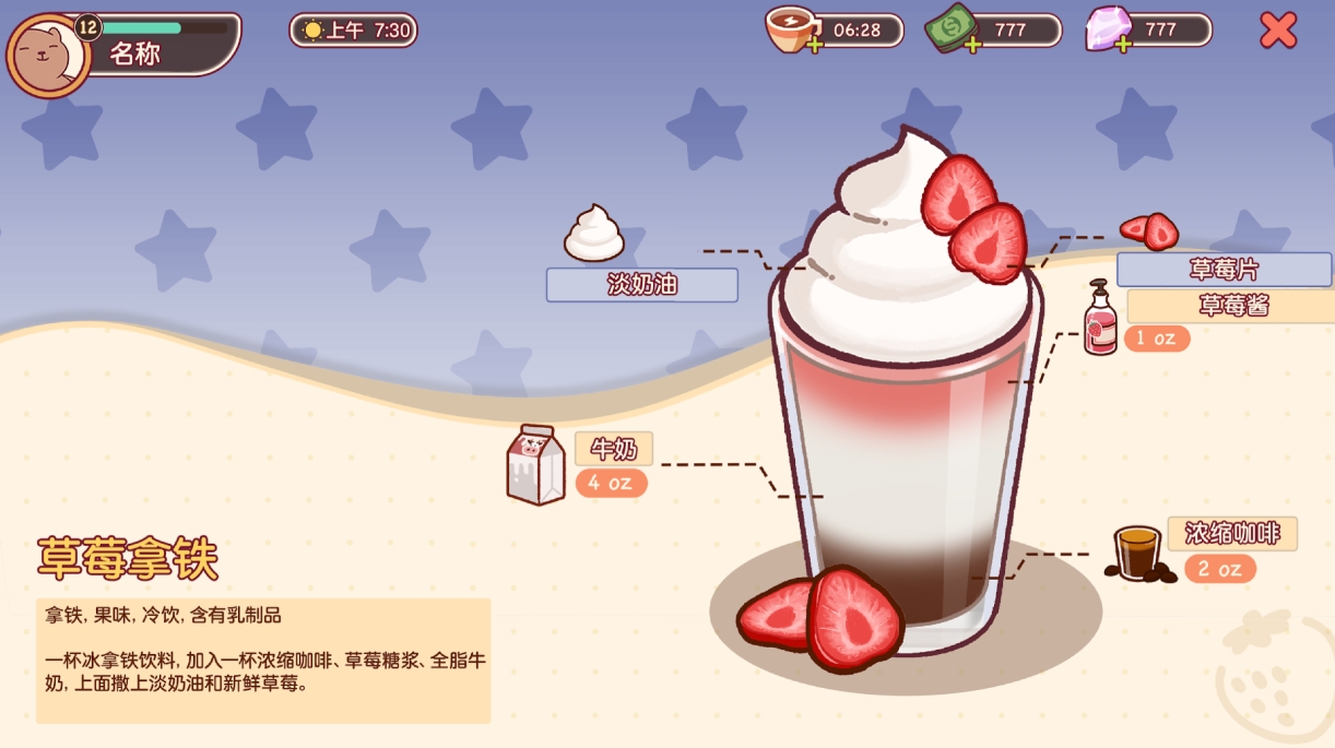 以上介绍的就是可口的咖啡草莓拿铁制作方法,在《可口的咖啡》中草莓拿铁不仅是一种美味的饮品,而且是艺术与技能的结合。无论是做为游戏中的一项任务,或实际生活中的一种饮料,以独特的口味和加工工艺变成咖啡发烧友的最爱,感兴趣的小伙伴快来制作体验吧!
