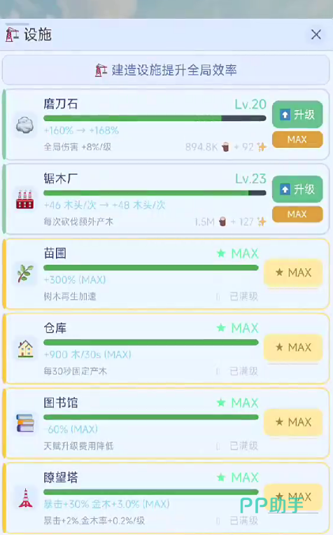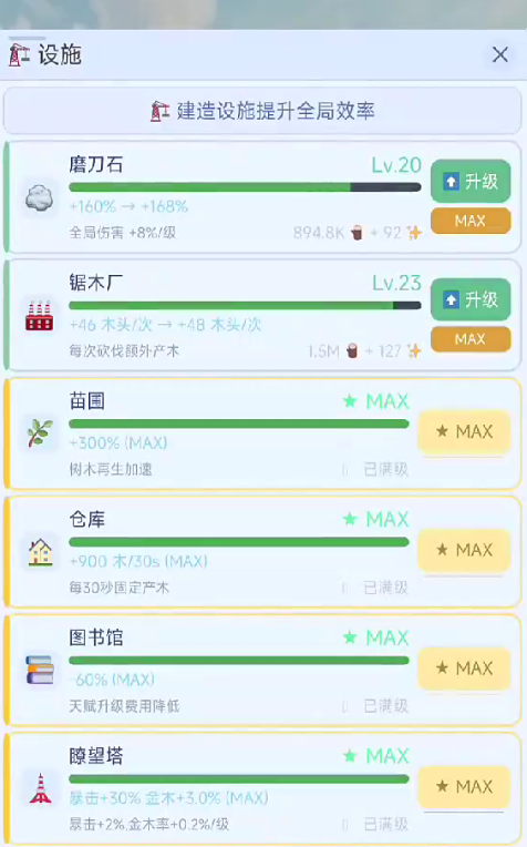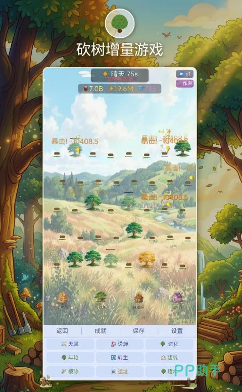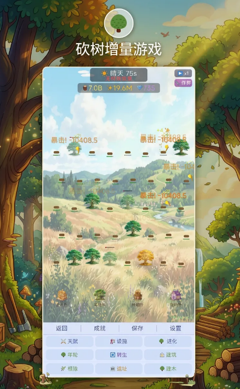 成长系统结构清晰:通过积累木材资源解锁新斧头、提升砍伐效率、习得自动伐木技能,并逐步开放地图区域与特殊树种。每阶段成长均有明确数值反馈,确保玩家在简单操作中持续获得养成成就感。