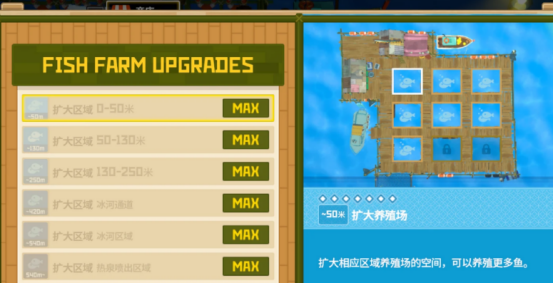 在养鱼系统中,每种鱼类的价格以及繁殖时间和速度都完全不同,玩家也可通过利用繁殖鱼类的方式赚到更多的钱。比如有很多鱼类可能繁殖的速度相对来说比较慢,需要花费大量的时间去繁殖,那么就会导致价格昂贵。