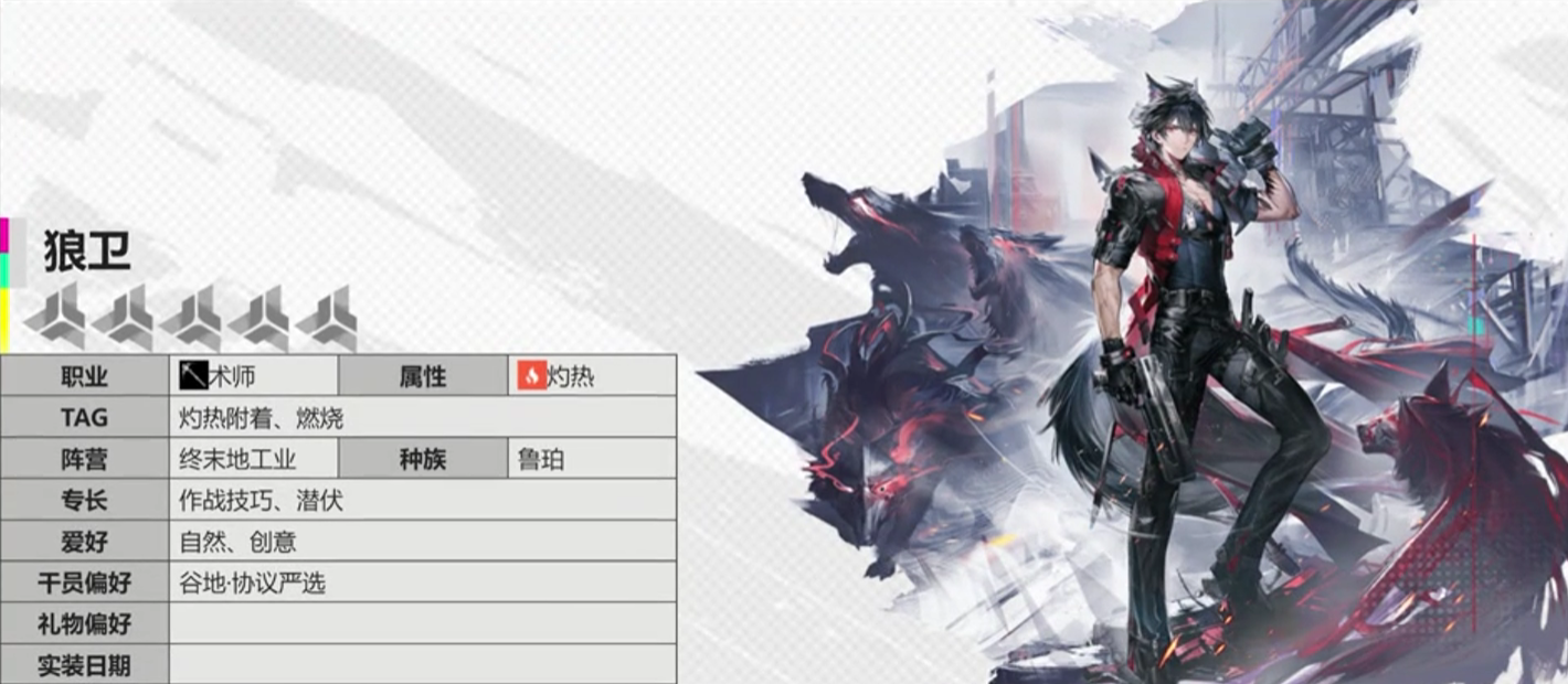 值得注意的是,终末地版本初期环境以火系队伍为主导,狼卫作为五星火属性干员,不仅获取门槛极低(剧情流程中直接赠送),更在42熔火机制中承担不可替代的职能。他在42小队中不仅能稳定提供火伤增益,还可通过叠火机制填补其他干员难以覆盖的伤害空缺,是理解并驾驭该机制的重要实践载体。