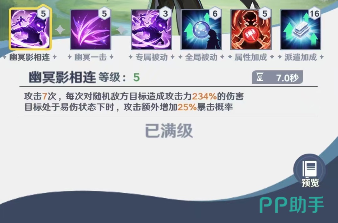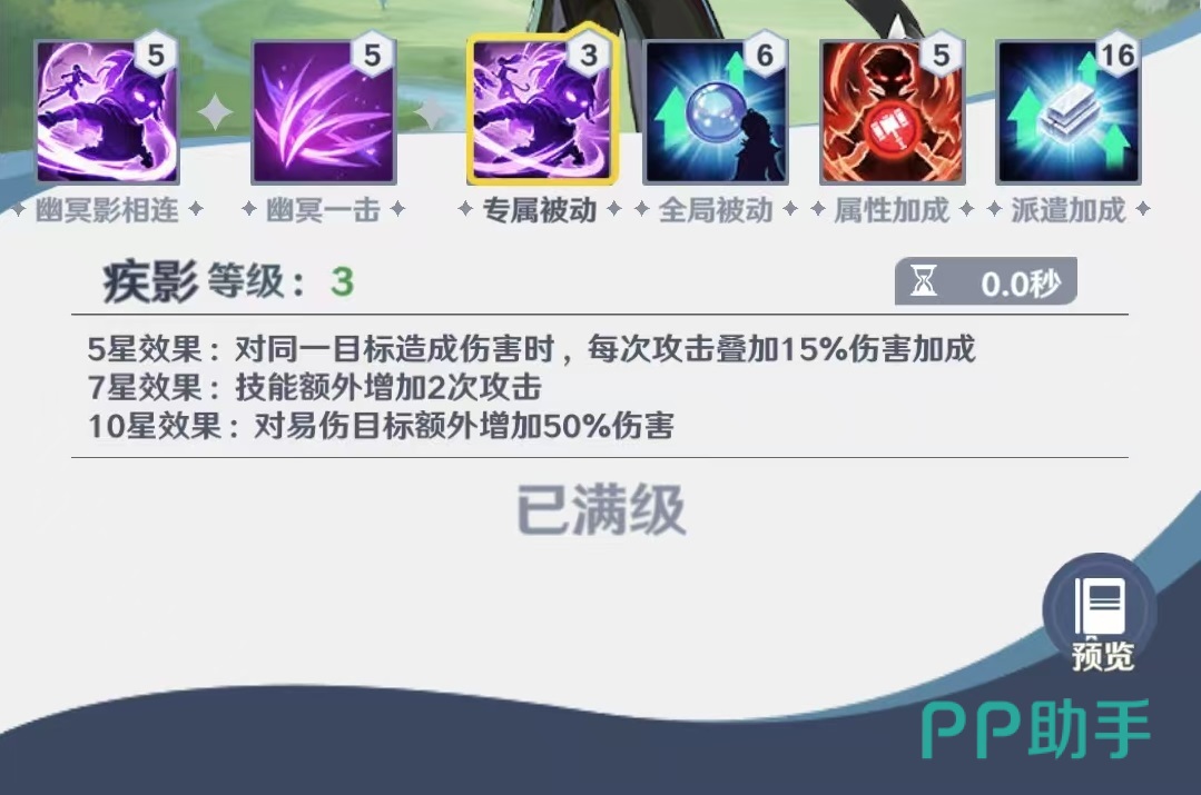 二技能“幽冥一击”为纯粹单体伤害技,适用于关键目标斩杀或破防场景。三技能为专属被动“疾影”,随星级提升逐步解锁三层强化效果:五星激活后,每次对同一目标造成伤害均可叠加15%伤害增益;七星阶段赋予技能额外两次攻击次数;十星终极形态下,对已处于易伤状态的目标追加50%伤害。四技能“天纵奇才”为全局被动,直接提升藏经阁资源产出90%。五技能提供全体属性加成,使所有魂师攻击力与生命值各提升5%。六技能“矿石专精”则强化派遣效益——当朱竹清被指派至铁匠铺时,相关派遣收益提升200%。