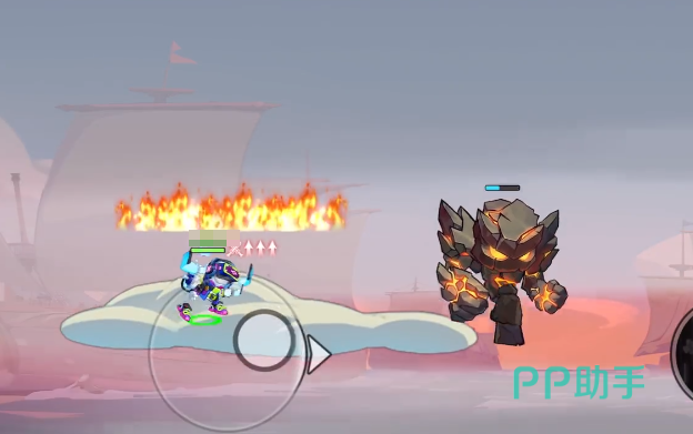 成功登顶后,玩家将面对宝箱带来的双重收益与风险:一方面可稳定获取强力道具;另一方面开启瞬间将召唤一名石头人怪兽。应对策略为——拾取武器后立即向上跳跃,此时将在原站立点生成可控火焰区域;角色落地后,火焰将悬浮于头顶,仅作视觉提示,不会造成持续伤害,亦不影响后续操作。