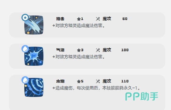 进化链清晰稳定:16级进化为波波拉,36级再次进化为水灵。每阶段进化不仅提升基础属性,还解锁新技能,整体战力呈阶梯式跃升。当前主流玩法为魔攻爆发流:利用“甩水”实现零PP消耗并积攒能量,“水泡”触发“浸润”后PP持续递减,形成越战越顺的节奏;“水光冲击”拥有140点高额魔攻基础值,配合回合数叠加机制,满层状态下可打出毁灭性伤害;若倾向均衡发展,“水炮盾”则是攻防一体构筑中不可或缺的防御型核心技能。