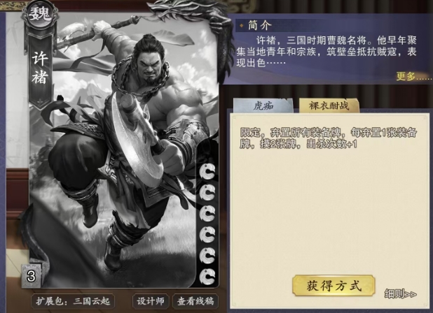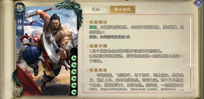 接下来说说许褚的第二个技能,这个技能叫做裸衣酣战,这是一个限定技能,每局游戏只能发动一次,发动时,许褚需要弃置所有装备牌,每弃置一张装备牌,就能摸两张牌,同时出杀次数也会增加一次,这个技能不仅会弃置许褚手中的装备牌,还会弃置他手牌中没有打出的装备,需要注意的是如果没有特殊描述,所有出杀次数增加的效果都只在一个回合内生效。