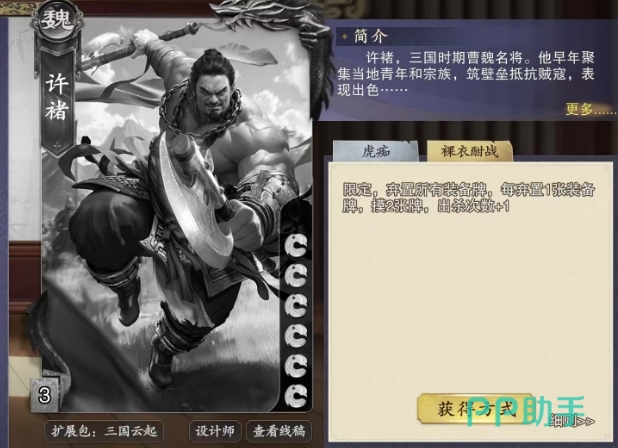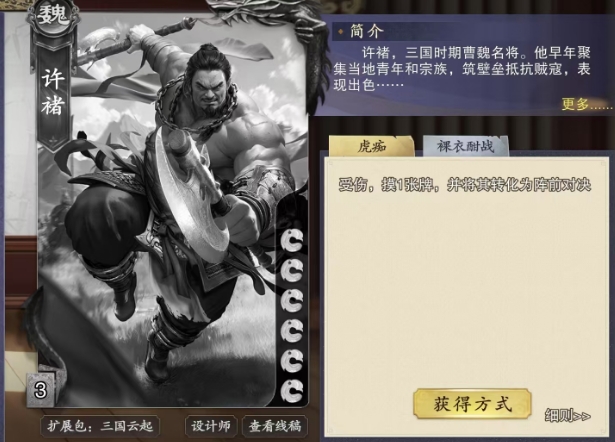 但这一个回合已经足够许褚展现他的威力了,如果他的身上装备足够多,那么通过裸衣酣战能摸到的手牌数量将非常可观,再配上合适的武器和距离,他几乎可以做到疯狂连杀,让敌人毫无还手之力,当然这个技能也可以与虎痴技能配合使用,让许褚能够更加精准地瞄准目标,所以只要许褚在场上,其他阵营的玩家对于这个卡是会优先打出局的,所以大家要注意在对局当中许褚的防守是否足够,只要杀足够其实先手直接一套攻击也是成立。
