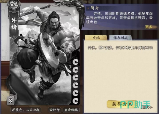 许褚在游戏开局便拥有6点血量,而他的虎痴技能,效果非常简单却实用,每当许褚受到伤害时,他就可以摸一张牌,并将其转化为阵前对决,这意味着只要许褚在战斗中受伤,他就能立即补充手牌,并准备好下一次的进攻,值得注意的是,只有通过虎痴技能受伤摸到的牌才会被转化为阵前对决,这一机制让许褚在进攻与防守之间找到了完美的平衡,他可以利用这个技能,不断地挑战敌人,即使一时处于下风,也能通过受伤摸牌来迅速调整战术。