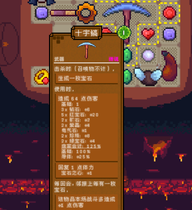 在背包英雄中,战斗强度高度依赖于背包内道具的排列方式。玩家需在有限的空间内合理放置各类装备,最大化输出能力。十字镐以T字型结构占据四个格子(两行三列),基础伤害为64点,具备击杀普通敌人后自动生成一颗宝石的特性,但该效果对召唤单位无效。装备后还会触发“宝石之心”被动,每场战斗结束后额外恢复1点体力值。更关键的是,当十字镐被置于背包中央位置时,周围相邻格子每存在一颗宝石,其伤害就会提升1点。由于其自身可不断生成宝石,因此能形成“产宝石→增伤→更快清怪→更多宝石”的正向循环,在清理小怪时效率极高。