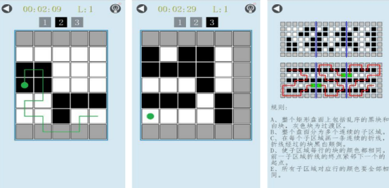 简约的画面,在开局后玩家只会看到黑色以及白色的方块,但是这些方块摆放的位置都是错综复杂的。玩家可通过在区域上划线的方式,确保每行的颜色相同,此游戏涵盖了多样化的关卡内容以及不同难度的等级,您可以结合自己的实际情况去挑战。此游戏也是需要三名玩家共同体验,通过轮流划线的方式,展现出自己聪明的智慧。