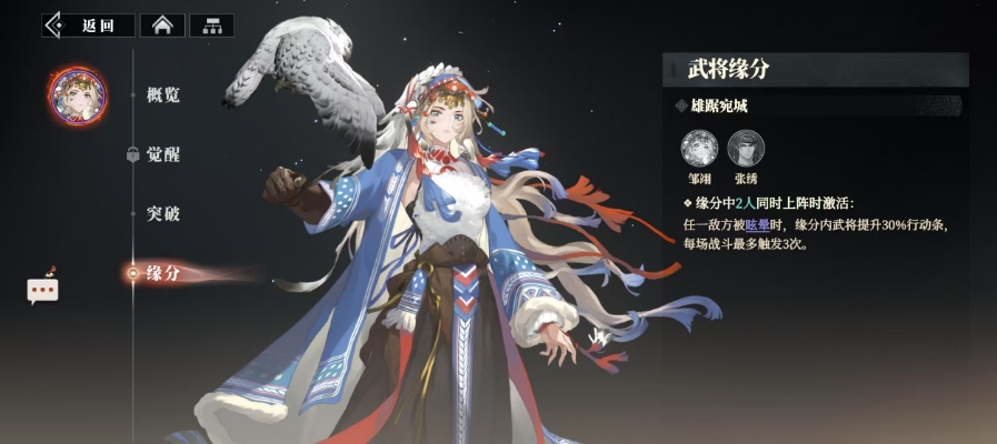 当然大家想要用好这个角色的话,其实邹翊也是有一些羁绊效果的,但是目前能够链接的角色不错,唯一的缘分就是她与张绣之间联系,共同激活名为雄踞宛城的缘分效果,当邹翊与张绣同时上阵时,这一缘分赋予了他们一种独特的能力,每当任一敌方被眩晕时,缘分内的武将便能瞬间提升30%的行动条,这种能力让他们在战斗中能够更快地出手,抢占先机,而且这种触发是有着充分保障的,每场战斗最多可触发3次,虽然次数不多,但是这个行动条增益带来的加成还是明显的,就是在数值上面后续要跟得上其他的输出才可以。