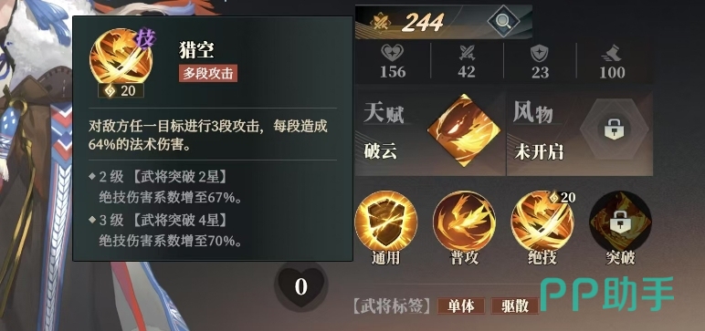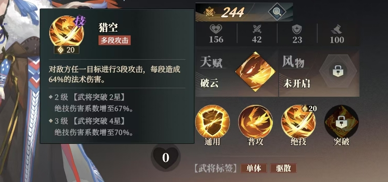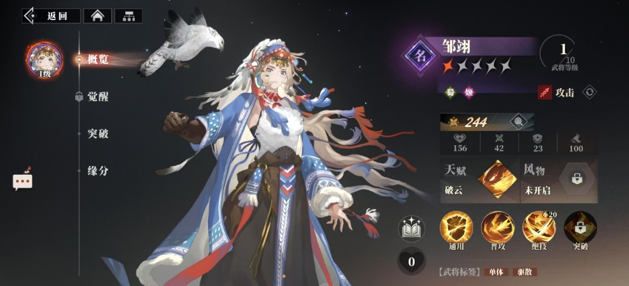 邹翊的普攻雕翎,当她发起攻击时,前排的敌方目标便将迎来一场85%法术伤害,此次攻击还附带了30%的暴击率,而她的绝技猎空,则是她真正的杀手锏,这一技能能够让她对敌方任一目标进行连续3段的猛烈攻击,每段都能造成64%的法术伤害,随着武将突破的深入,2星突破时这一绝技的伤害系数便能提升至67%,而4星突破时,更是达到了惊人的70%,使得她的攻击力更加恐怖。