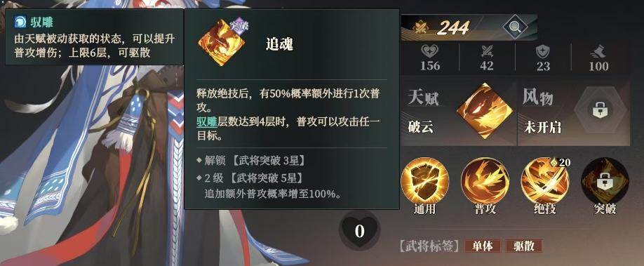 除了强大的主动技能外,邹翊还拥有一项独特的突破技能叫做追魂,每当她释放绝技后,便有50%的概率额外进行一次普攻,大家可以看成是一次追击技能的效果,而当她的驭雕层数累积到4层时,普攻更是可以无视敌方阵型,直接攻击任一目标,这种灵活性让她在战场上其实有很多种用法,驭雕的效果并非凭空而来,而是通过天赋被动获取的状态,它不仅能提升邹翊的普攻增伤,还能在达到上限6层时被驱散,值得一提的是当邹翊达到武将突破5星的时候,她的追加额外普攻概率将增至100%,这意味着她在战场上几乎可以每一个回合都有追击效果,每一次输出都是连接的两次。