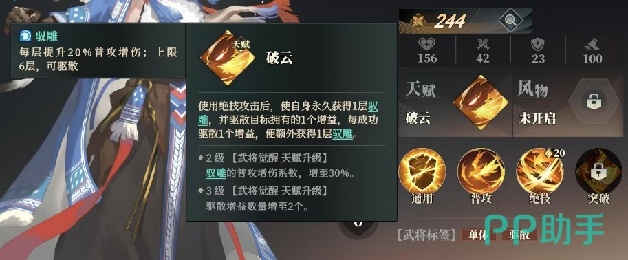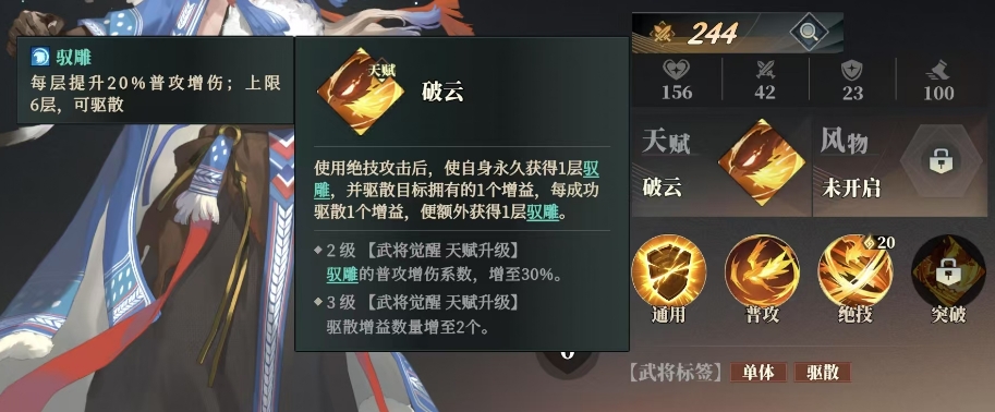 邹翊的天赋效果破云,每当她使用绝技攻击后,不仅会使自身永久获得1层珍贵的驭雕状态,还能精准地驱散目标所拥有的1个增益效果,这就是天赋触发 的效果,而更为巧妙的是,每成功驱散1个增益,她便能额外获得1层驭雕,这种设计使得她在战斗中能够迅速积累优势,每层驭雕都能提升她的普攻增伤,达到了20%的高额加成,且这一效果可以叠加至上限6层,当达到2级武将觉醒天赋升级时,驭雕的普攻增伤系数进一步提升至30%,而升级至3级时,她的驱散能力每次攻击能够驱散的增益数量增至2个。
