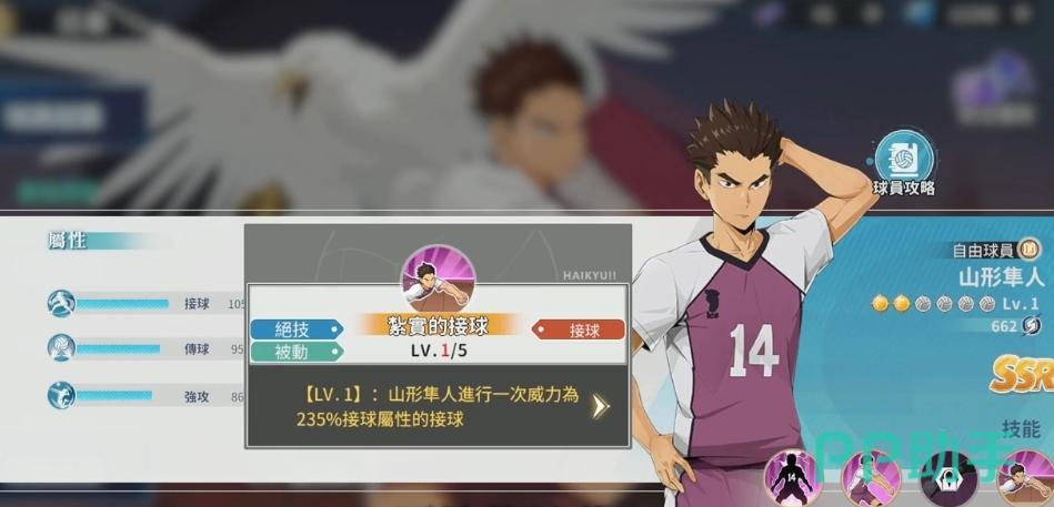 技能2可以带来威力为救球属性120的救球效果,这个技能能够有效地挽救即将落地的球,技能3是当对方球员拦网结果为Perfect时,自身该次救球属性+40%,这个技能进一步增强了山形在救球属性上面的成功几率,最后的绝技则是带来威力为接球属性235%的接球,这个技能是山形的核心能力之一,然而除了技能之外山形上阵的一个缺点是暂时没有任何羁绊加成,这意味着他无法通过与其他特定角色的组合来获得额外的属性提升或特殊效果,所以配队上面加成很少。