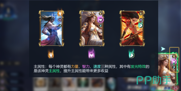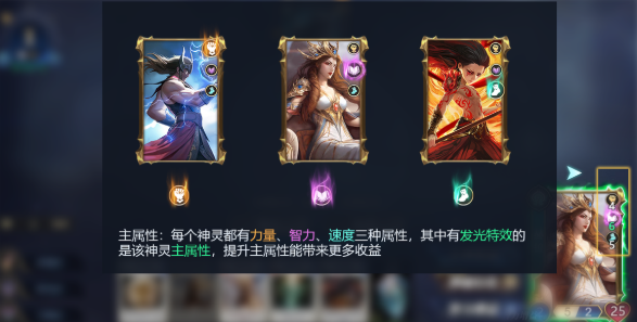 游戏中这些神灵会拥有力量,智慧,速度这三种基础的属性值,大家在选择角色时,也可以着重注意一下他们独特的主属性,会有一个醒目的发光特效,为大家显示帮助玩家们更好的来识别与了解,这种主属性也是非常重要的,后续也会获得相应的属性增益的技能。