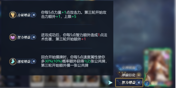 每一种属性增益的方向也是不一样的,如果大家是力量增益,就可以提升攻击的能力,如果是智慧增益,就可以来提升法术的输出,如果是速度增益,是可以来摸取更多的卡牌,这些属性增益的效果都会进一步的得到强化。大概在第三个回合就可以进行游戏的整体节奏,也会不断的加快。