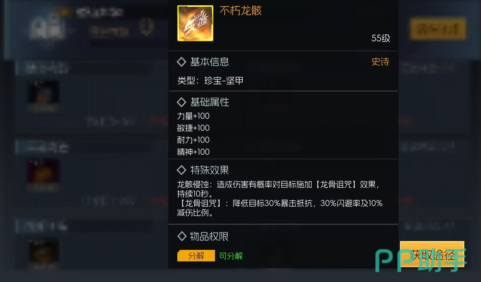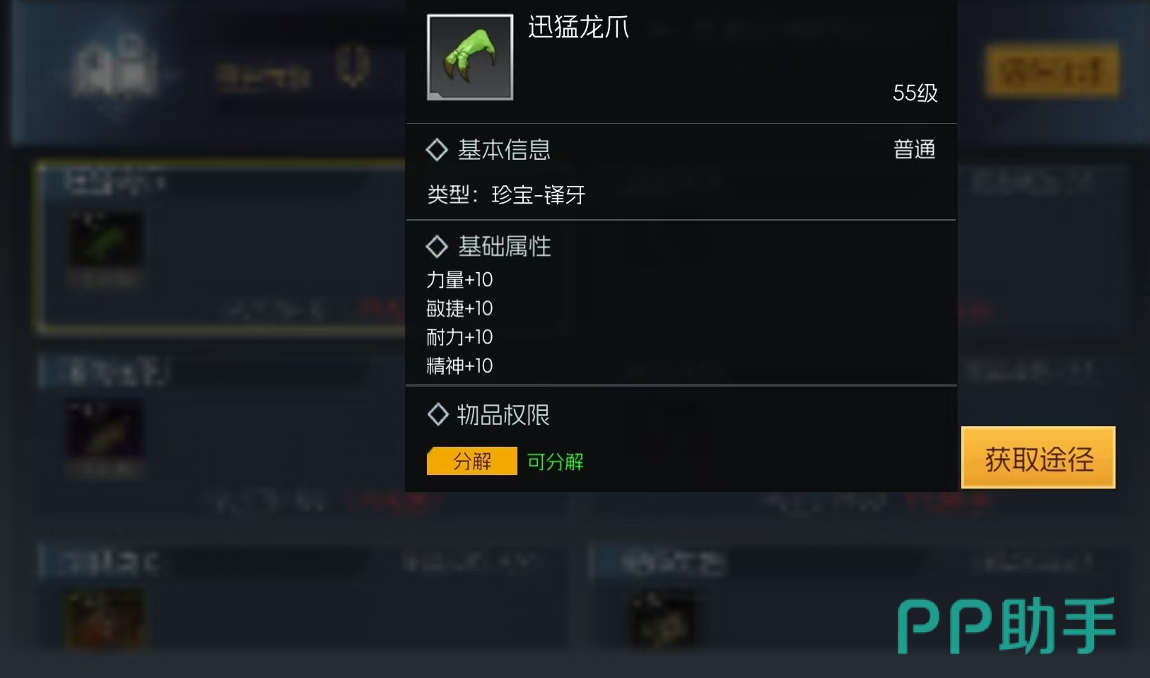 若想获取稀有级别的珍宝,则需挑战普通以上难度的“逃生之路”关卡才有机会掉落。而史诗级或神话级珍宝无法直接刷取,必须通过打造系统合成,所需材料多来源于高阶副本奖励,整体获取门槛较高。新手期推荐使用由迅猛龙爪、破碎龙骨与棒球手套组成的普通珍宝套装,每件均可提升力量、敏捷、耐力及精神各10点,适合前期过渡使用。进阶后可更换为高级珍宝组合,如剑龙甲刺、硬质龙鳞与深海之珠,单件属性增幅达20点。