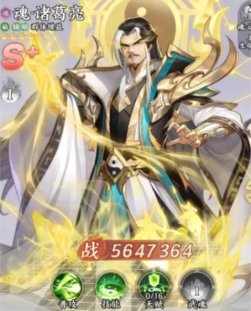 第三位为魂·诸葛亮。本体已具备稳定辅助能力,而魂化后质变明显:新增大招群体回血机制,使其在辅助位更具战略价值。一魂阶段即拥有50%概率触发必杀追加,三魂、四魂阶段则大幅强化八卦阵的覆盖范围与治疗量,并同步提升护盾强度与持续回合数。整体成长曲线偏向长效续航,中后期可承担半肉半辅职能,在持久战场景中表现尤为突出。