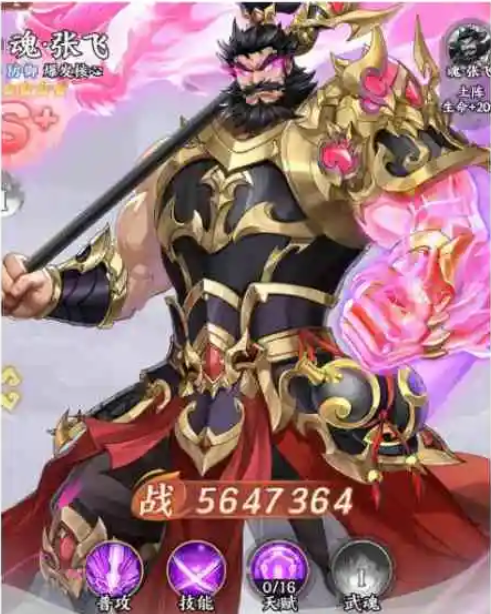 最后是魂·张飞。其定位为高优先级防御枢纽:基础嘲讽命中率随星级线性提升,9星时可达100%稳定生效,成为控制链起点;多数技能均以嘲讽为前置条件触发,形成技能闭环。天赋系统解锁后,可搭配破甲类武将扩大压制面;高魂阶段解锁的无敌盾具备强保核能力,适用于BOSS战与PVP关键回合防守。