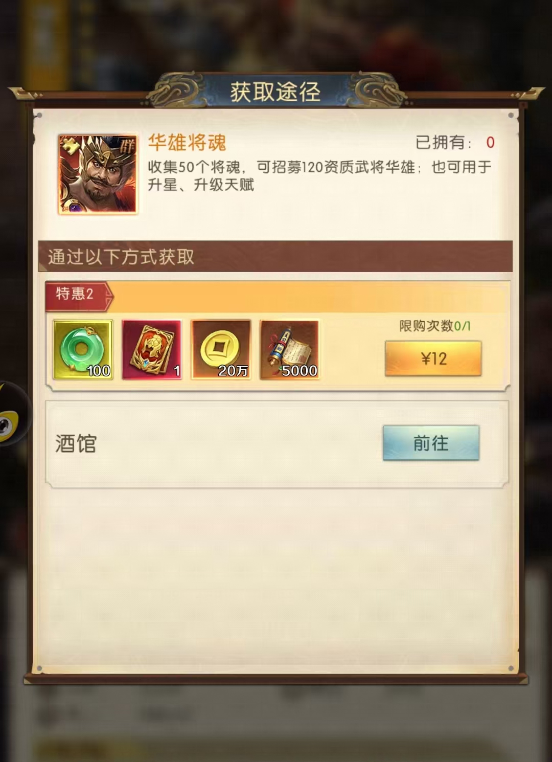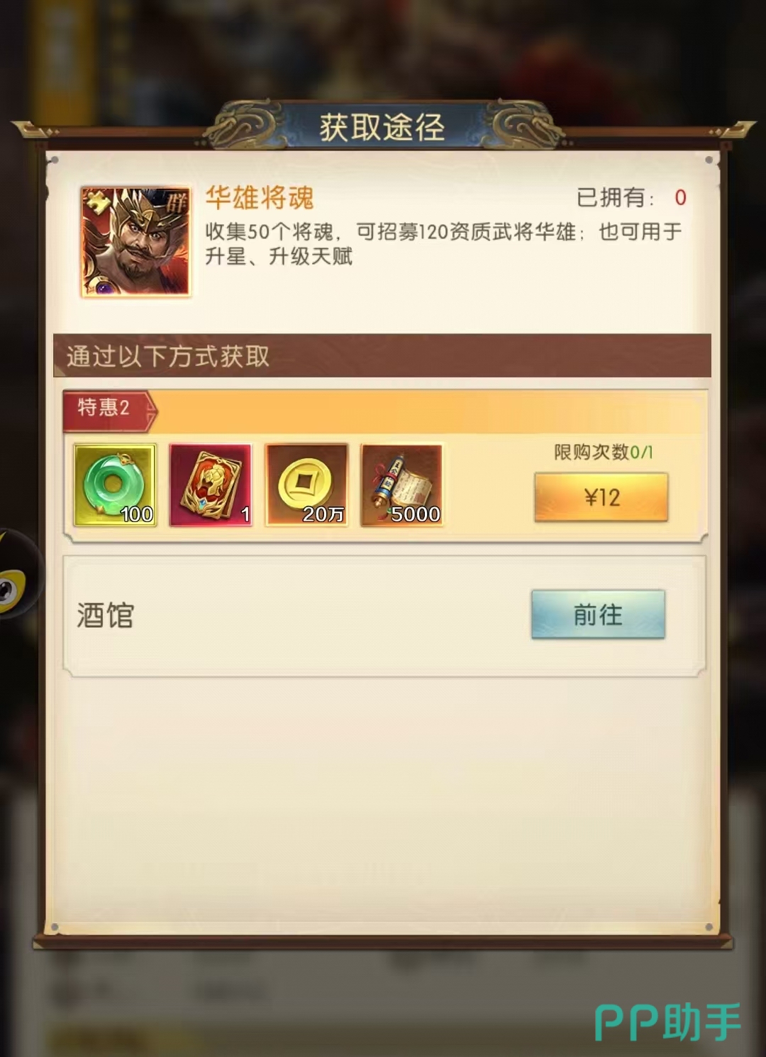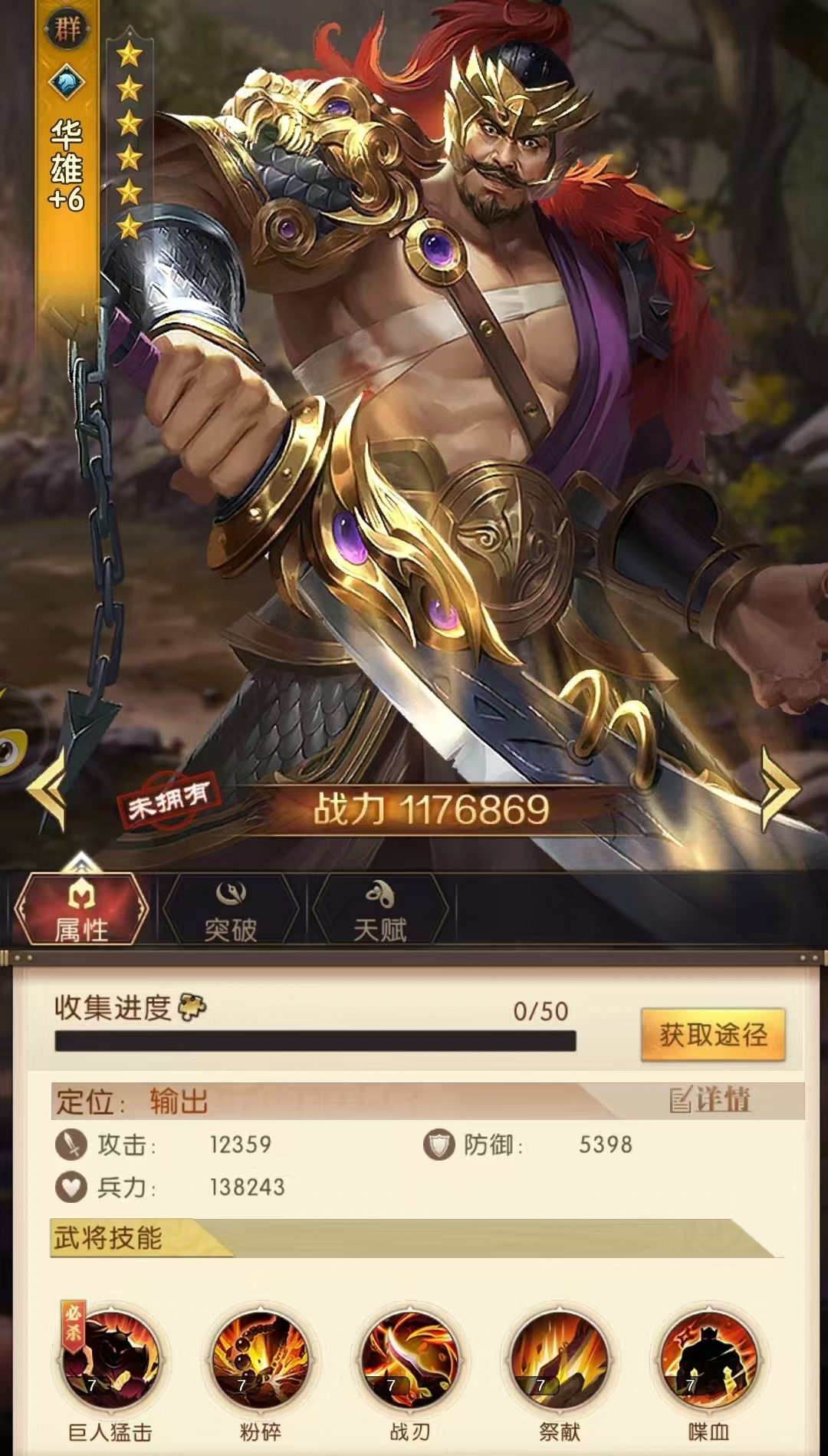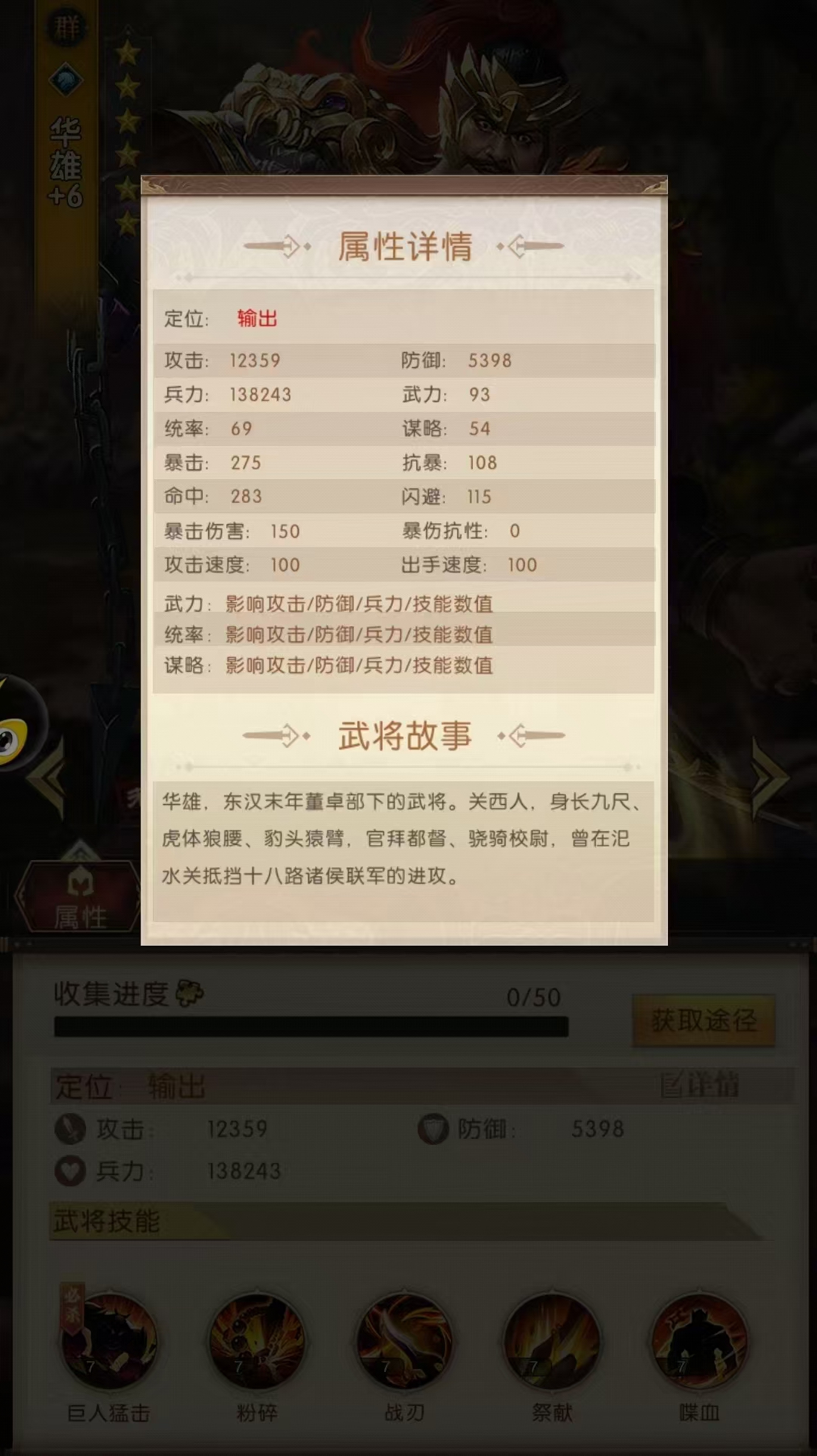 华雄角色的阵营是群雄阵营,在游戏中也是一位橙色武将。作为骑兵他的输出能力和伤害可想而知,目前在游戏中获取该角色的方法是通过日常招募或者12软妹币充值获取。不过游戏福利很多,积攒招募令应该是能够抽取到角色的。