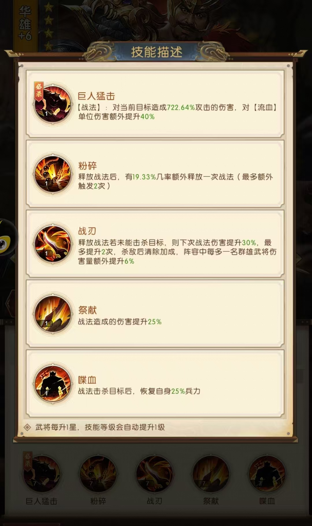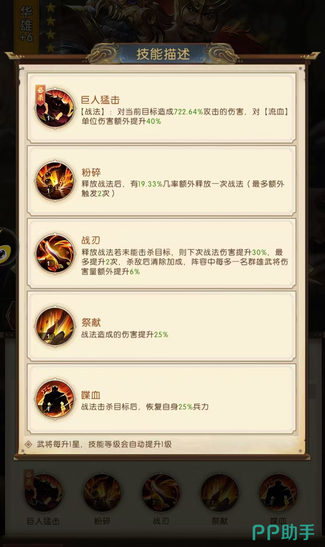 其余的技能都是要武将进行突破之后慢慢解锁,但是威力也很强大、技能【粉碎】能够真正释放战技之后有jiejin20%de机会再释放一次战法技能,不过最多触发2次。【战刃】是为战法叠加buff,将战法的伤害进行提升。【献祭】能够提高25%的战法伤害。