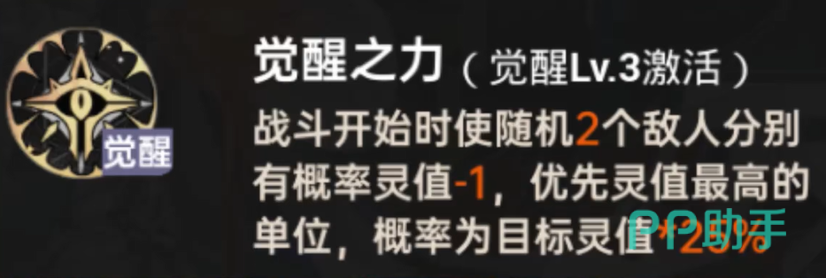 觉醒系统进一步强化控场稳定性:1星觉醒提升对灵值≥4目标的灵值削减概率至45%;3星觉醒可在战斗初始阶段,按25%×目标当前灵值的概率,随机对2名敌方(优先灵值最高者)削减1点灵值;5星觉醒于偶数回合结束时,30%概率为全体敌人施加攻击力下降,并在施加任意负面效果时,30%概率额外增加1层效果层数。