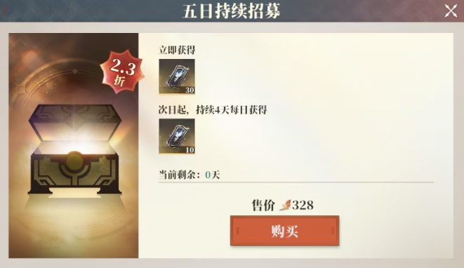 有一个五日持续招募的礼包其中包含的七杀符比较多,购买之后能立刻获得30抽的机会,然后从次日起,持续4天每天还可以再获得10抽,这样合计起来就是70抽啦,这么看的话折扣力度还是相当大的,所以如果三山壁用完了,又打算氪金抽心愿池的话,建议尽量选择买礼包来抽会更划算。