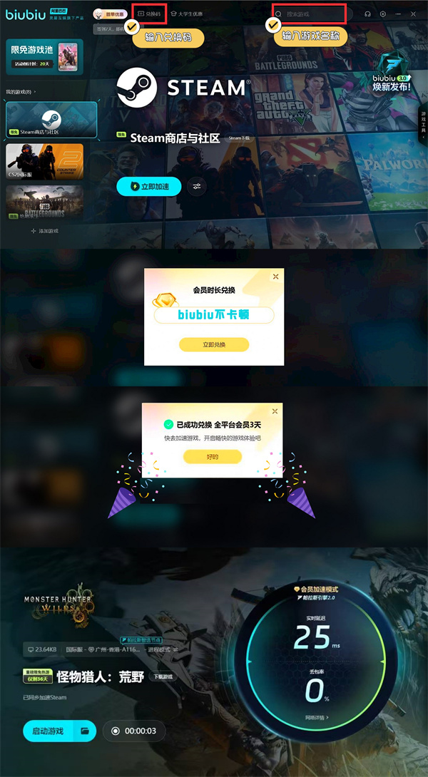 同时对于部分想要解锁更多福利的朋友,到时可考虑去点击兑换,然后去输入【biubiu不卡顿】就能顺利的拿到72H的加速时长,助力玩家获得更为畅快的体验,重点是现在使用它来加速怪猎,玩家还不用担心会遇到炸房。