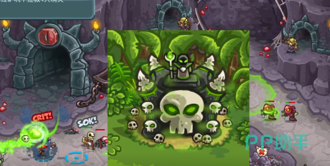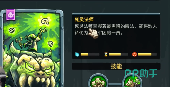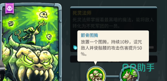 其核心技能之一为颤骨图腾,可在战场上召唤一个持续10秒、影响半径达250范围的诅咒图腾。进入该区域的敌方单位会被施加减益效果,同时范围内所有骷髅类友军单位将获得攻击力增益。技能升级后,冷却时间缩短,释放频率更高,显著提升了团队协同作战能力。