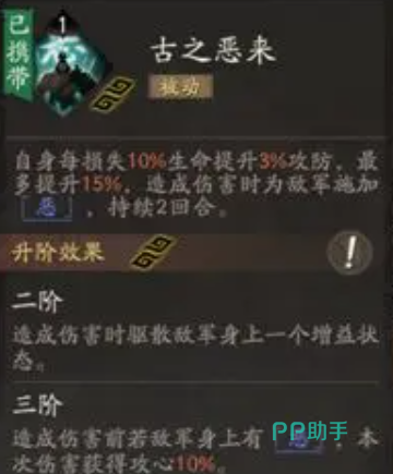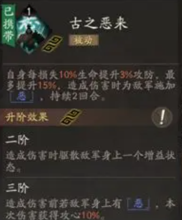 他的主动技能“古之恶来”是其核心战斗力来源。该技能效果为:典韦当前生命值越低,所获得的攻击力与防御力加成越高,在血量降至50%左右时达到属性增益峰值,最高可提升15%攻防数值。此外,每次成功造成伤害后,还能使目标陷入“攻防削弱”状态,使其攻击与防御降低10%,持续两回合。技能升级后,还可额外驱散目标身上一个正面增益状态,极大削弱敌方关键单位的作战效率。