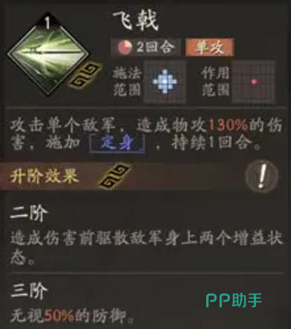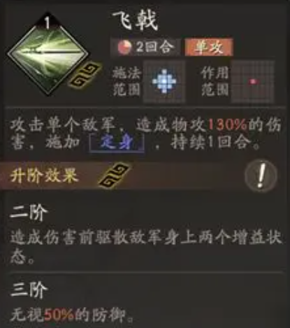 搭配使用的推荐技能为飞戟,这是一个针对单体高价值目标设计的强力输出技。释放后可造成130%物理伤害,并附加“定身”效果,阻止目标在下一回合移动。对于行动频繁或走位灵活的敌人,此控制效果极为关键。技能升级后,还可判定目标身上存在的两个增益状态,并根据数量提升追加收益。面对高防御对手时,该技能还能无视其50%防御数值,显著提升打击效率。