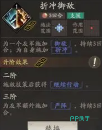 另一个重要技能为“折冲御敌”,此技能不仅能为友军施加严阵状态,提供长达三回合的减伤效果,还能让典韦在释放后继续行动一次。当敌人对典韦发起攻击且被严阵抵消部分伤害时,最多可减少10%所受伤害,有效提升前线抗压能力。该技能在团战开启阶段尤为实用,既能保护队友,又能维持自身的机动性。