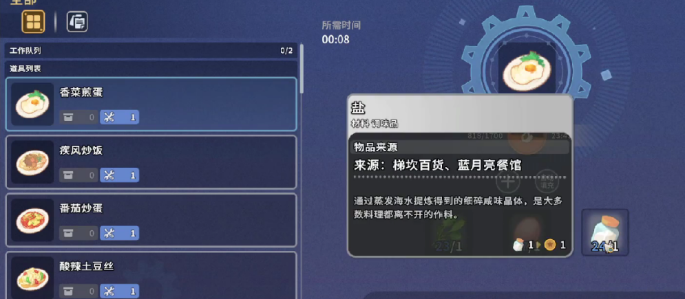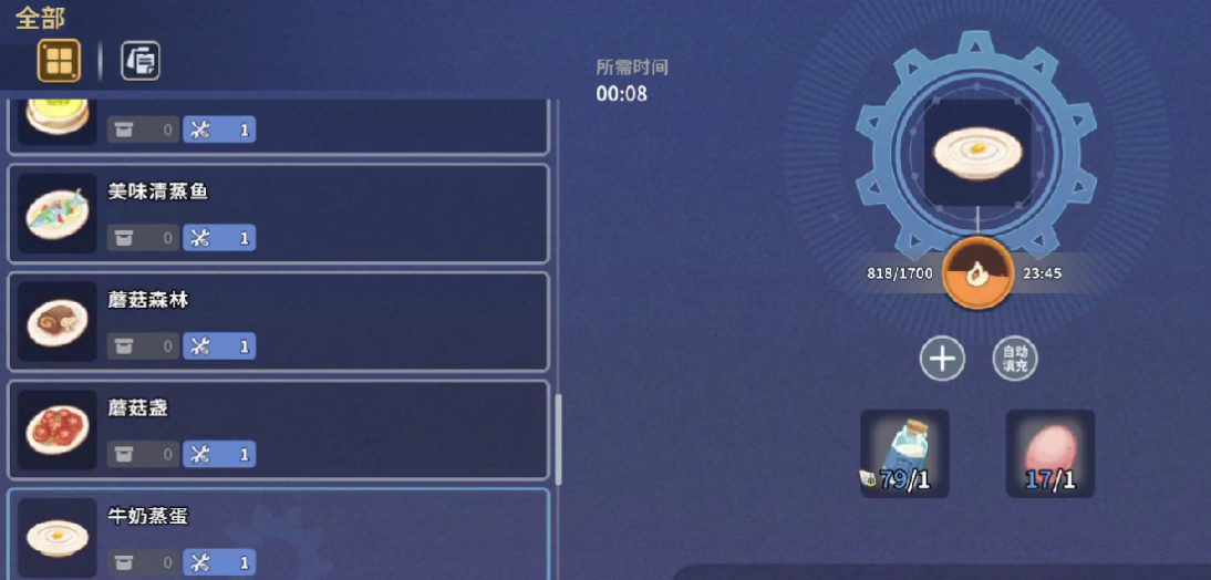 实际制作过程极为简洁:将鸵鸟奶与鸡蛋投入已激活的初级或更高级烹饪台,静待8秒即自动完成。该时长在全游戏料理中属于较快梯队,适合批量生产。最终成品品质受角色当前烹饪等级直接影响——等级越高,产出星级越高,对应的生命恢复量、饱食度加成及NPC好感度提升效果也越显著。