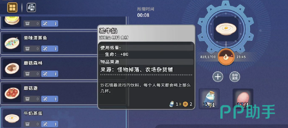 在《沙石镇时光》中,牛奶蒸蛋是一道兼具实用性、易获取性与高性价比的料理。它不仅制作周期短、所需材料常见,还能用于任务交付、NPC赠礼及状态恢复,是新手至中期玩家日常饮食与社交系统中的重要选择。本文将系统梳理其完整制作流程,并重点提示关键门槛与常见误区,帮助玩家高效解锁这道核心食物。制作牛奶蒸蛋的前提