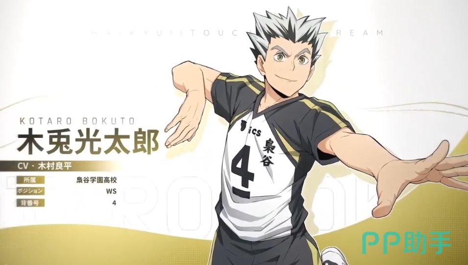 首先是木兔光太郎,他是东京枭谷学园高中排球部的主将兼王牌,实力排在前几的强攻手,在队伍当中也是被其他队友宠爱照顾着,木兔光太郎会一边大喊一边扣球,扣球成功也会大喊,一旦练起扣球就没完没了,也是他教会日向翔阳必杀技,扣球也是他绝对的优势,他的扣球技巧非常出色,每次扣球都能给对手带来巨大的压力和威胁,他的扣球速度极快,力量强大,同时具有很高的准确度,所以得分不错。