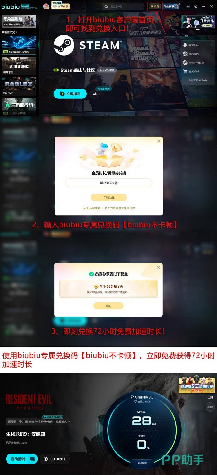 本作已登陆Steam平台,支持Windows系统运行。需特别说明的是,《生化危机9》采用D加密技术,启动及游玩全程需保持联网验证。在网络延迟较高或连接不稳定的环境下,可能出现加载卡顿、验证失败等问题。建议玩家在启动游戏前开启biubiu加速器,并确保其处于最新状态。当前biubiu已升级至3.0版本,搭载全新帕拉斯引擎,并由职业电竞选手左梓轩参与专项网络调优。新注册用户可享叠加福利:首24小时免费体验 + 使用“biubiu不卡顿”活动兑换3天会员,总计达96小时加速时长。