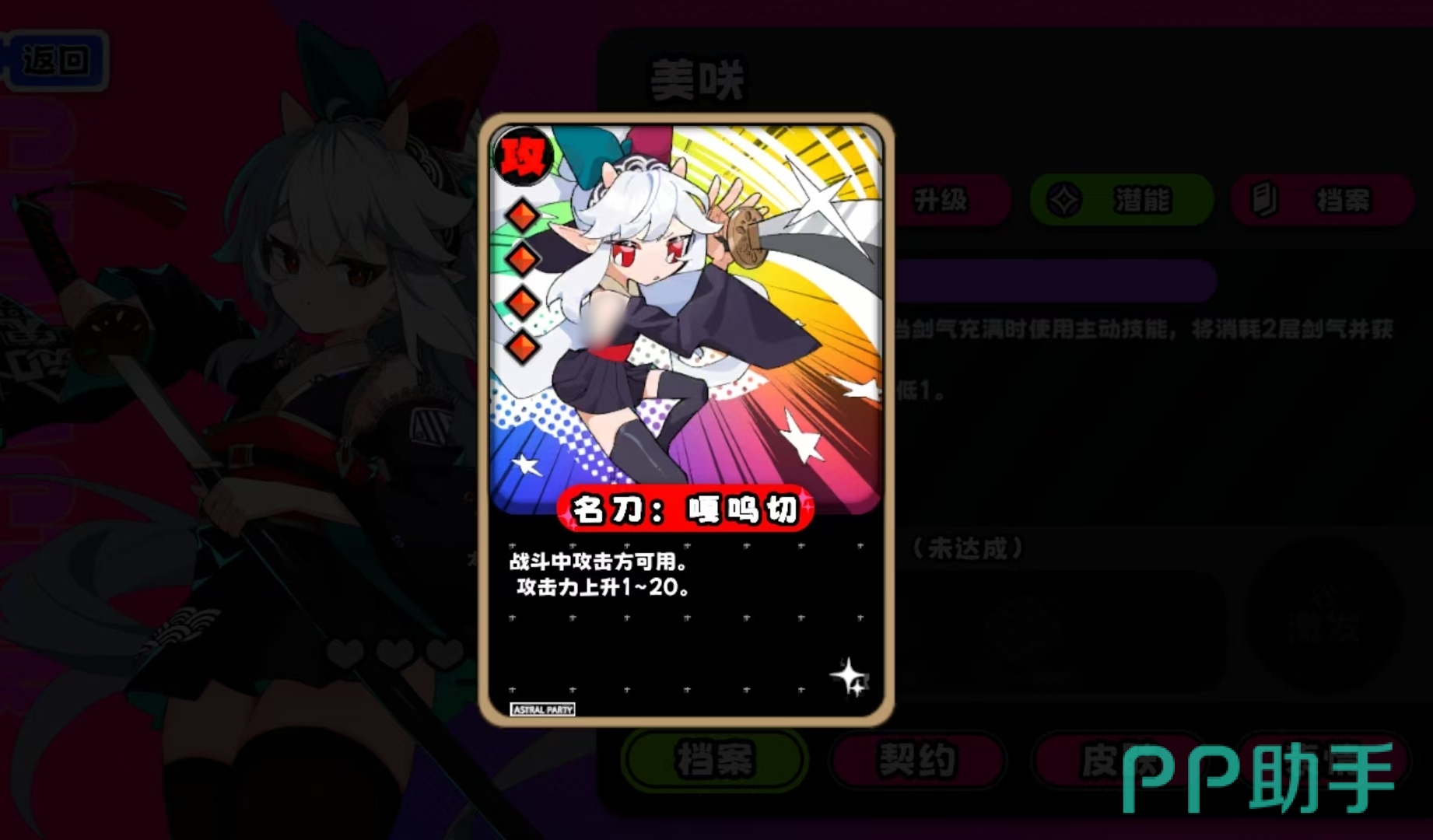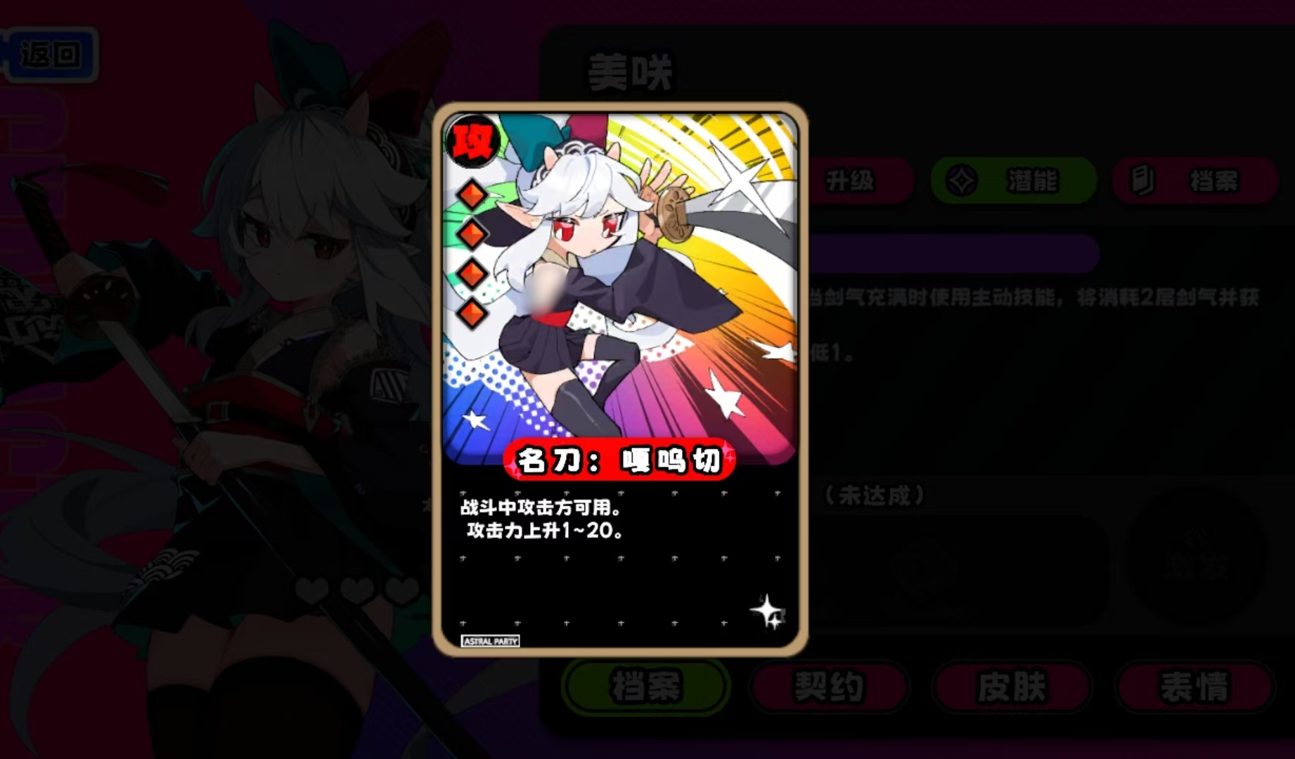 从养成维度看,美啖的等级成长具备明确梯度收益。资源有限时,优先升至2级并完成一星升阶,即可解锁全部基础属性加成,包括攻击力与生命值提升,确保她在各模式中具备扎实的生存与输出基础;后续资源充裕后,再推进至满级以最大化战力。此外,其潜能系统具备双重强化价值:一方面扩大主动技能作用范围,提升战术容错率;另一方面,当剑气叠满3层后,使用主动技可消耗其中2层,立即获得手牌【名刀噶呜切】,且该手牌购买费用降低。此联动机制可在战斗中高频触发高额攻击增幅,形成极具压制力的输出循环。