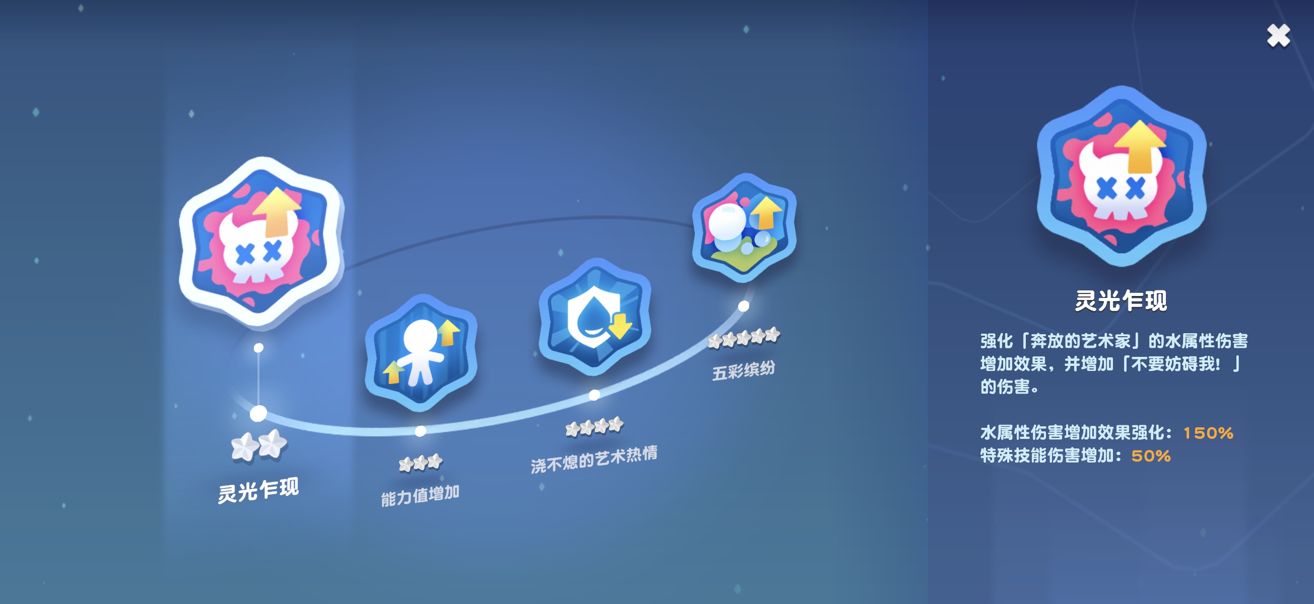 该角色拥有三项核心技能体系:被动技能可使所有水属性伤害提升8%,为队伍中的水系输出角色提供稳定增伤;普攻为连续两次泡泡糖投射,具备基础压制节奏;特殊技能命中后为目标施加“黏滞标记”,持续6秒,期间目标移动速度降低30%,显著削弱其机动性与躲避能力。